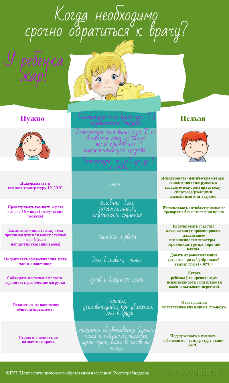 Когда необходимо срочно обратиться к врачу? У ребенка жар! Температура тела выше 39 °C. Температура тела выше 39 °C не снижается через 30 минут после применения жаропонижающего средства. Читать далее >>