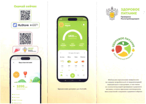 С целью внедрения принципов здорового питания среди населения, расширения знаний в вопросах питания Роспотребнадзором разработано мобильное приложение «Здоровое питание». Оно направлено на защиту потребителей от недостоверной информации о продукции, в том числе не соответствующей принципам здорового питания, а также призвано мотивировать пользователей к ведению здорового образа жизни.